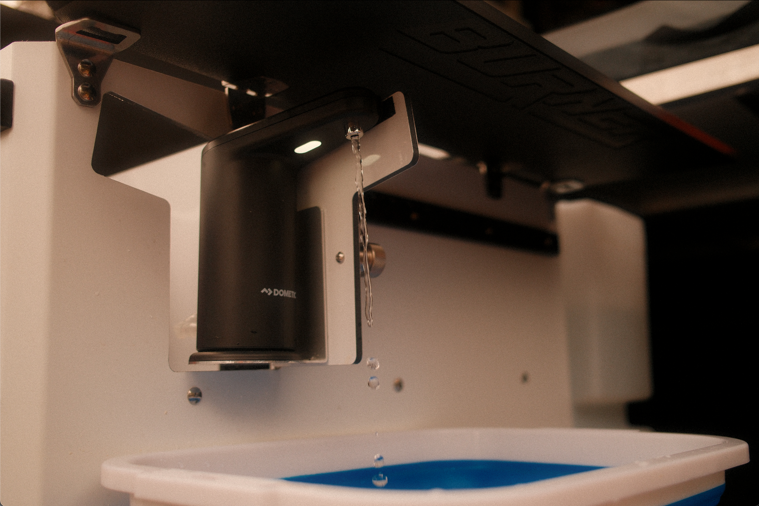- Dometic GO Hydration Water Faucet installed with quick connect to water tank
