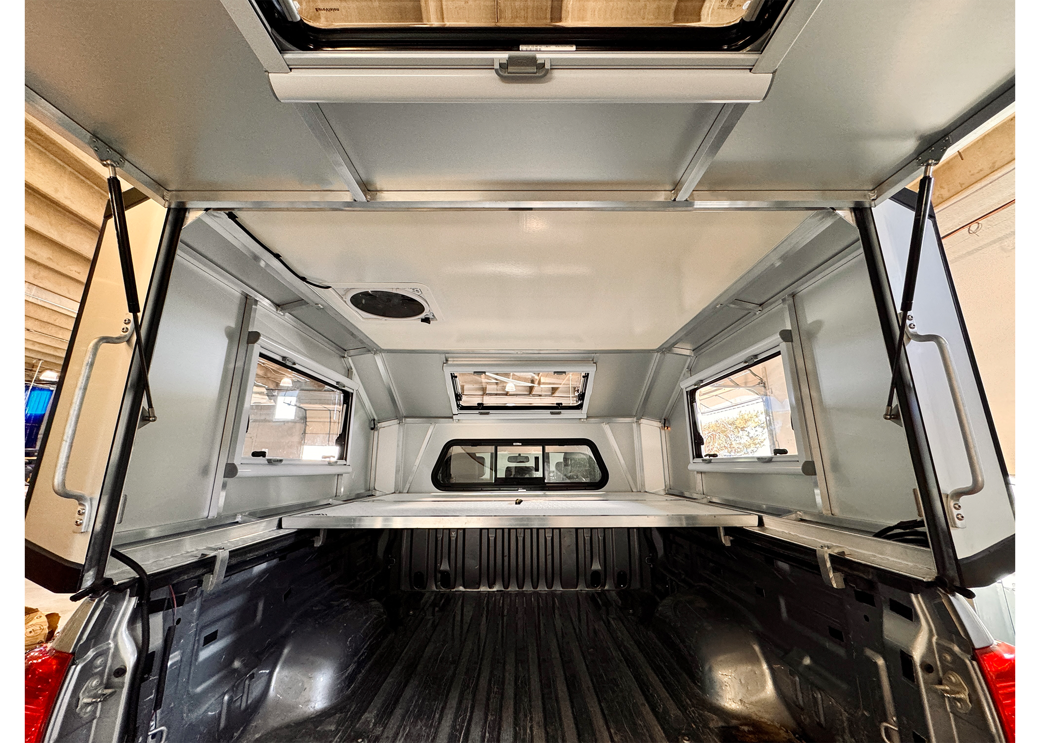 MoonLander is one of the lightest truck bed campers on the market. It drives like a topper, not a camper. The two lofted bed panels are removable, giving you massive amounts of space to haul stuff with your truck. It is also aerodynamic, minimally impacting gas mileage on the highway.