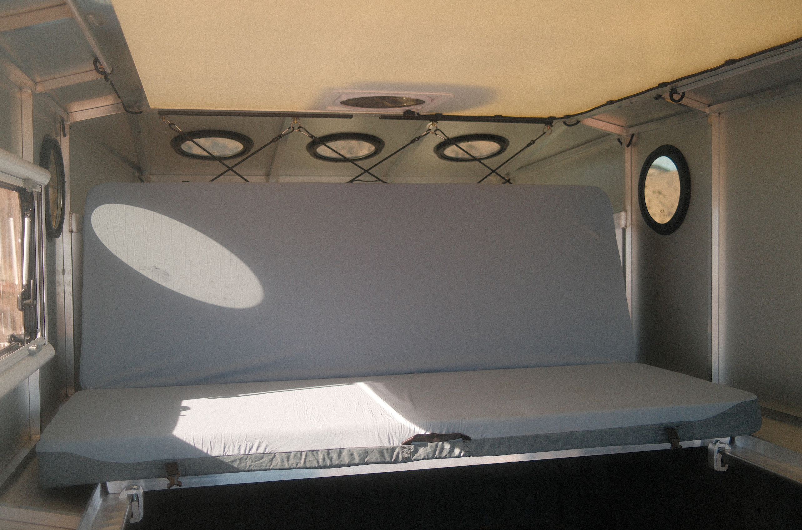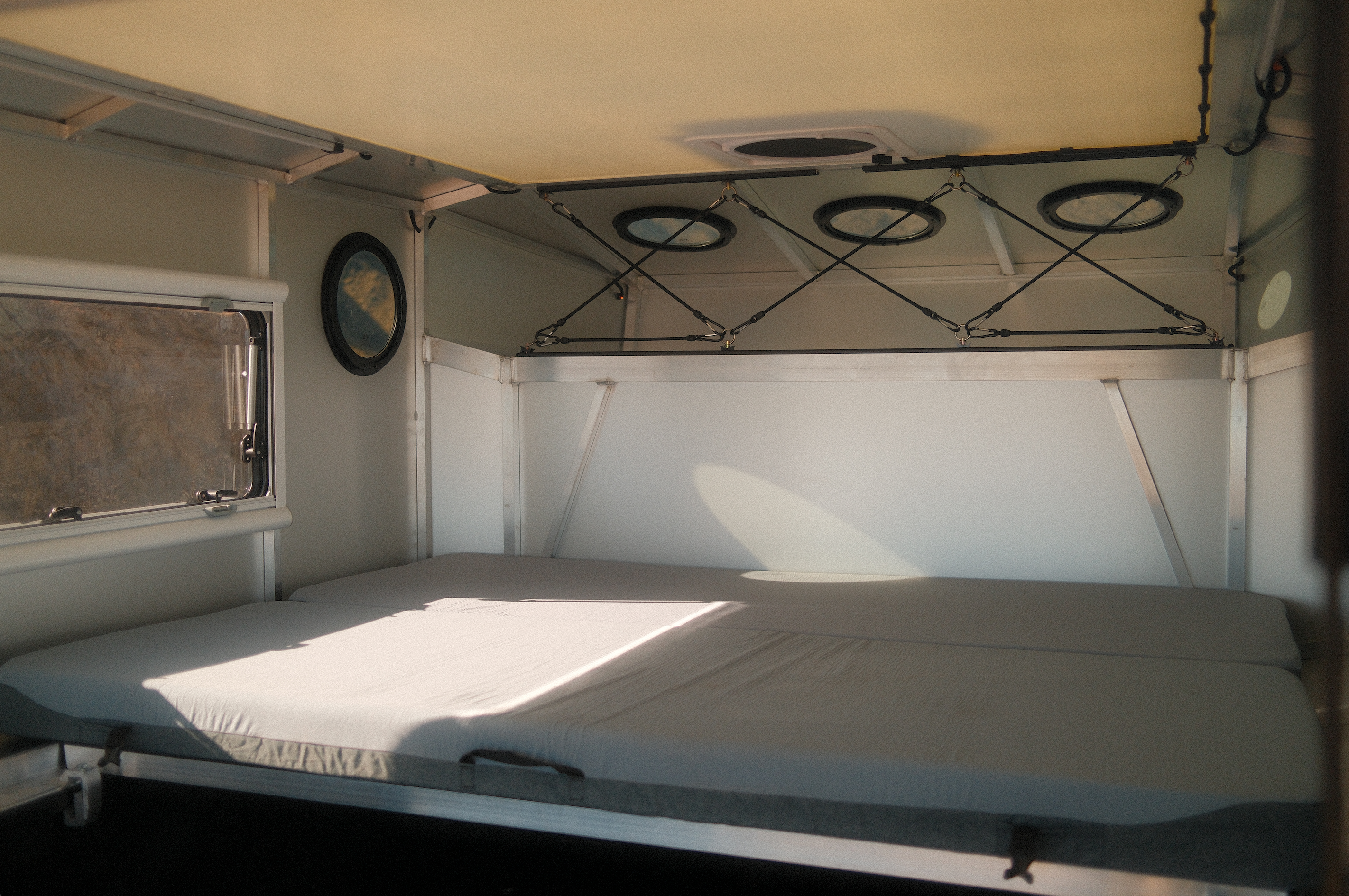 Lay the bed panels flat to enjoy the original East-to-West sleeping setup MoonLander offers. With ample headroom, you can sit up comfortably, stretch out, and easily access your gear from the cab-over section. 6FT to 7FT of sleeping length, depending on configuration.