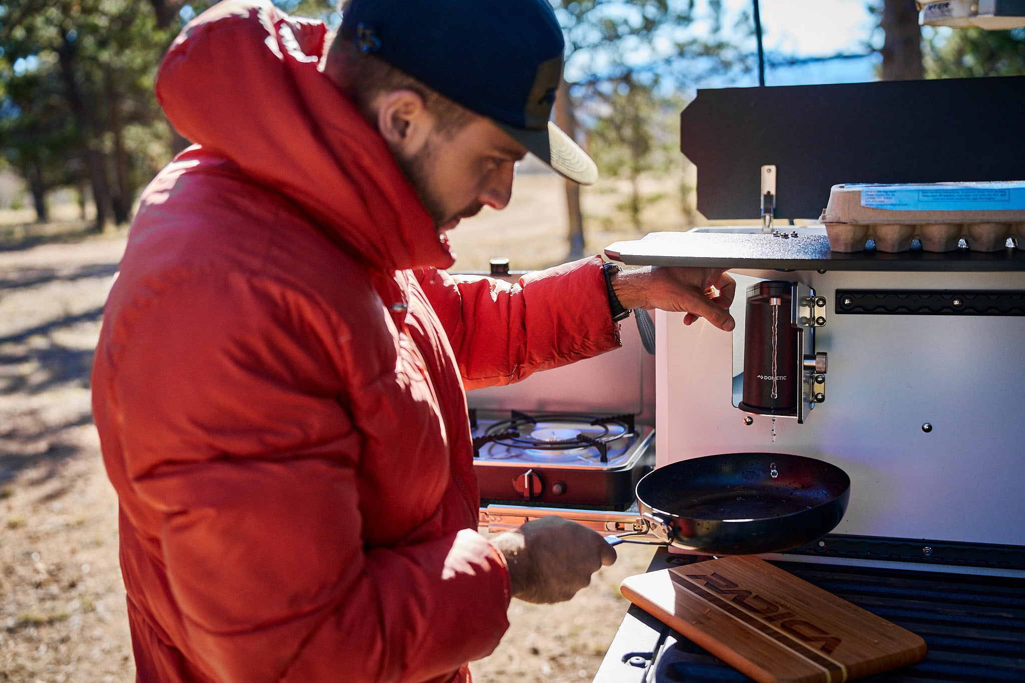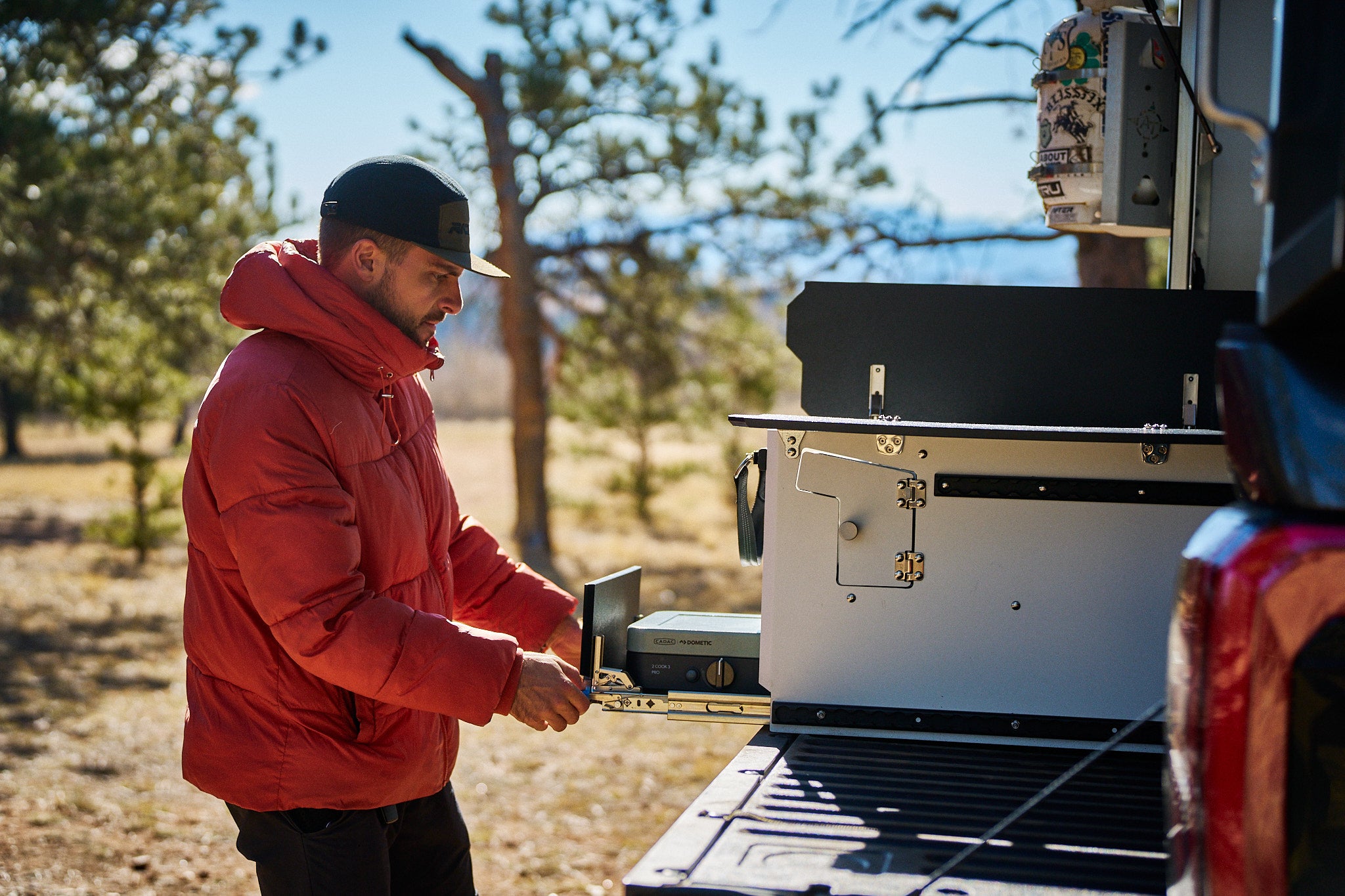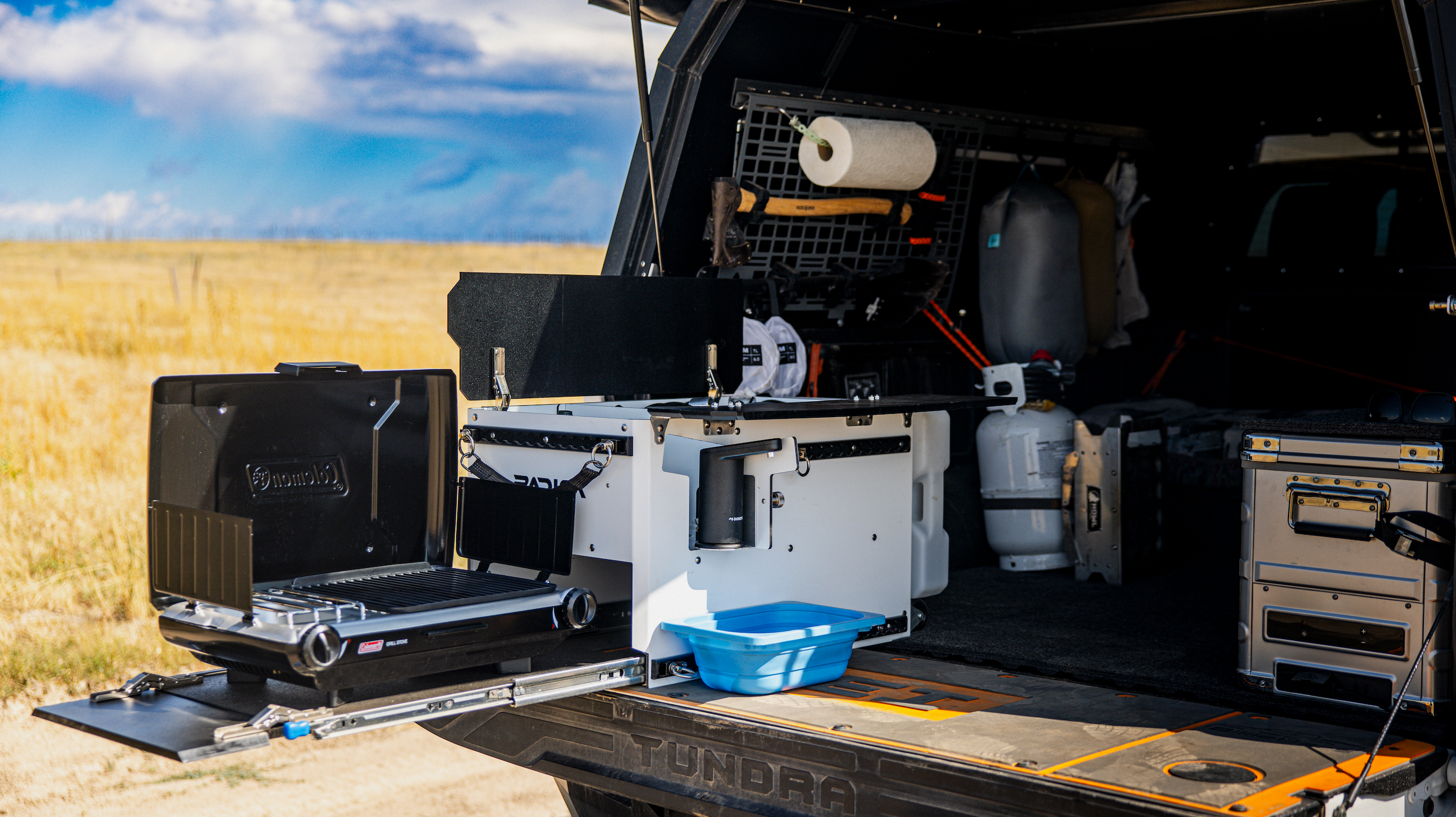 AfterBurner has a lot going on under the hood. We packed it tight to keep space available in your truck bed or SUV. It features a stove, running water, internal storage space, paper towel holder, and it doubles as a seat or work surface when not in use. On top of that, you can remove it by yourself and roll it into the garage after a weekend of fun.